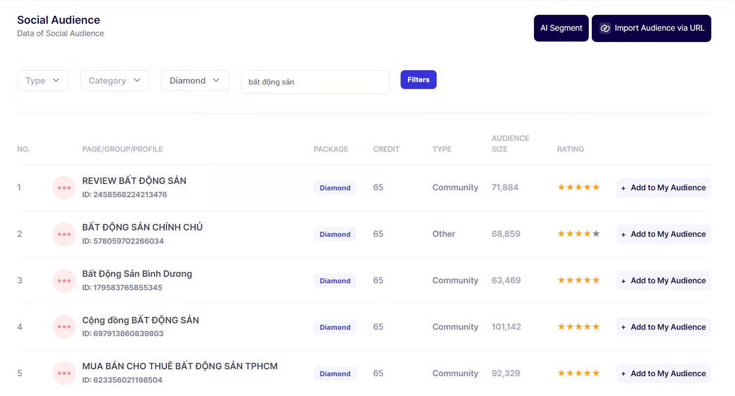 **02. Solution:** The marketing team at Tuấn123 used user sets from Facebook groups relevant to their project segments. After using the Data Processing features to mix and process data to find the most suitable audiences