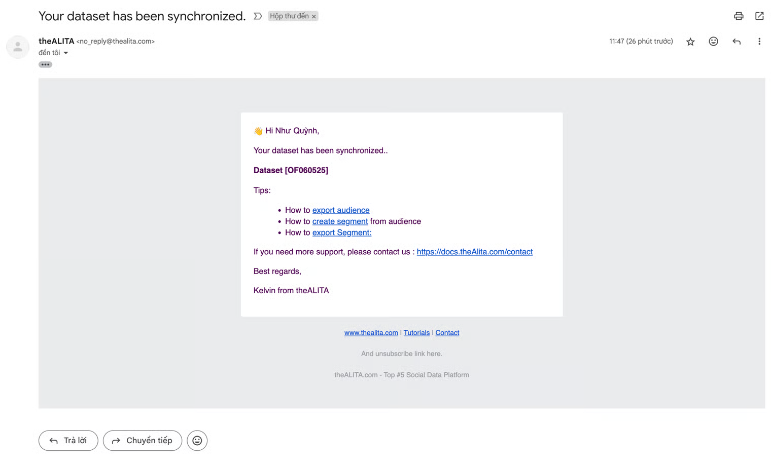 <figure><img src="https://1538408613-files.gitbook.io/~/files/v0/b/gitbook-x-prod.appspot.com/o/spaces%2FOnal3rPabp77VtqFEojv%2Fuploads%2FVS9VJfkIrVlcb9qns6GJ%2Fimage.png?alt=media&#x26;token=36d46fb1-8db8-483e-b327-25befdc1e3a8" alt=""><figcaption><p>Email notification from theAlita</p></figcaption></figure>