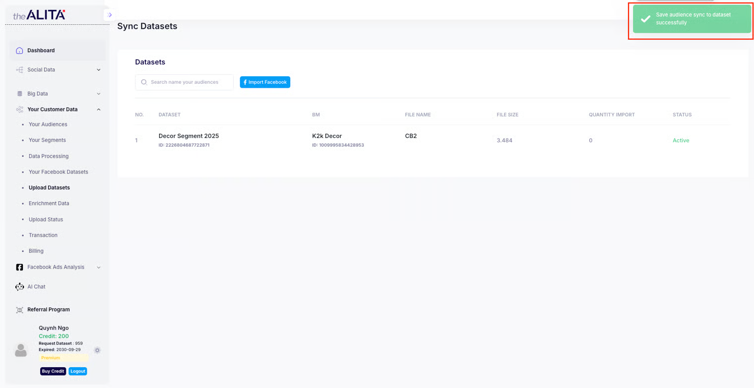 * Imported: Audience data has been successfully pushed to the Dataset. Simultaneously, theAlita will send you an email notification.