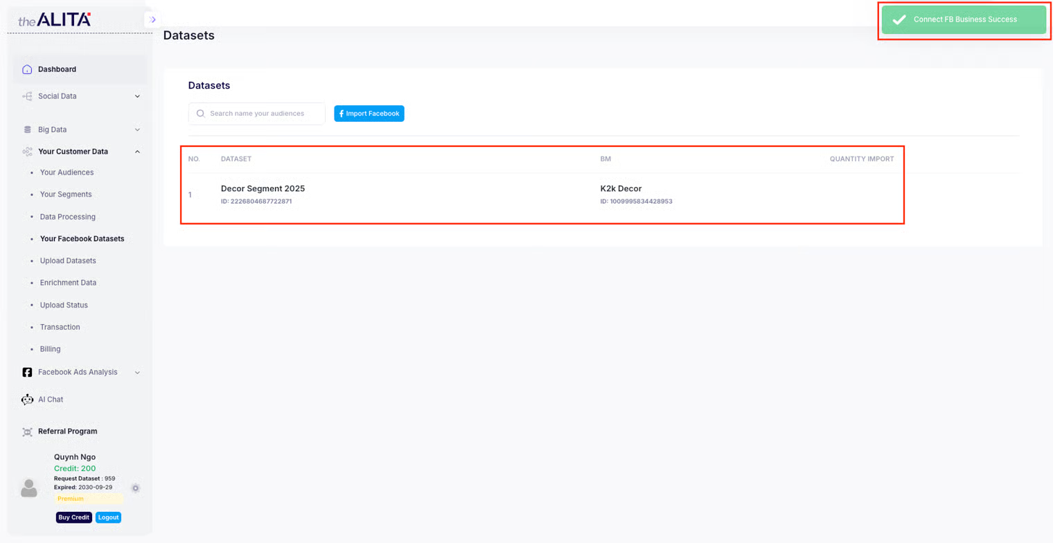 5. After successful connection, the system will display a list of Datasets and corresponding Business Manager names.